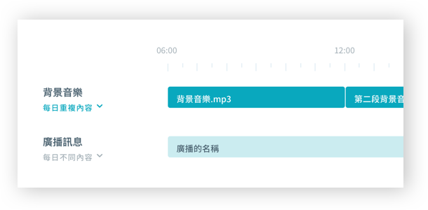 循環播放的背景音樂清單,定時放送的廣播訊息